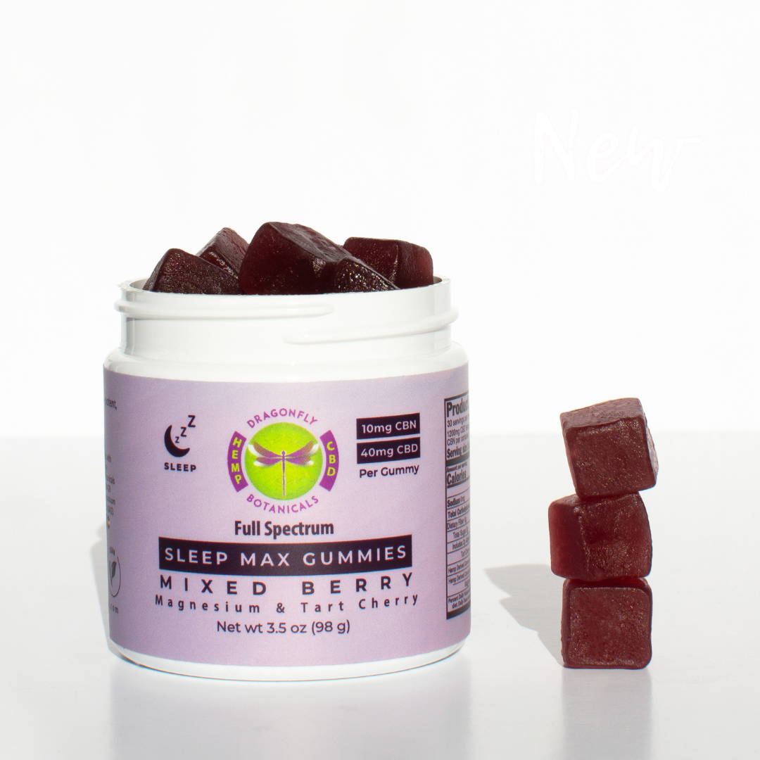 Full Spectrum Sleep Gummies in a mixed berry flavor with CBD, CBN, magnesium, and tart cherry. Available with or without melatonin.