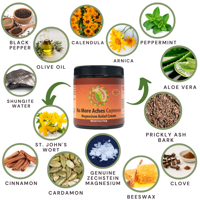 Olive oil infused with Cayenne Fruit*, Ginger Root*, Calendula Flower*, St. John's Wort Herb*, Arnica Flower*, & Prickly Ash Bark, Shungite Water, Aloe Vera Liquid*, Colloidal Silver, Genuine Zechstein Magnesium Chloride, Beeswax, Essential Oil Blend of: Peppermint*, Black Pepper*, Clove*, Cardamon*, Cinnamon Leaf* & Vitamin E Oil